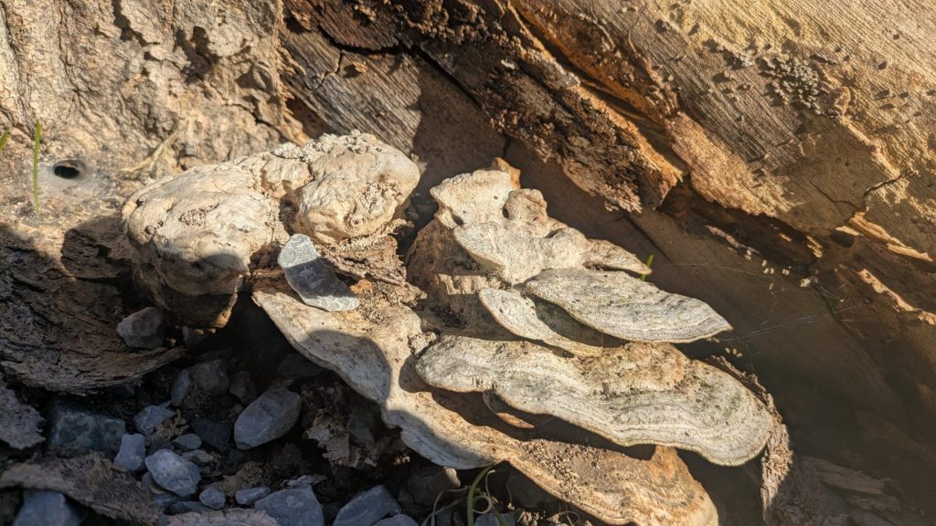 結構駐車場の中にありますよね。ボロボロに朽ちていますが、全体がシロアリの糞で覆われています。まだ営巣しているかは地上からは見えませんが、湿った木に生えるキノコがある、つまり雨が降ると全体に水が染み込み含水率(物質に含まれる水分の割合)が高いことがわかります。